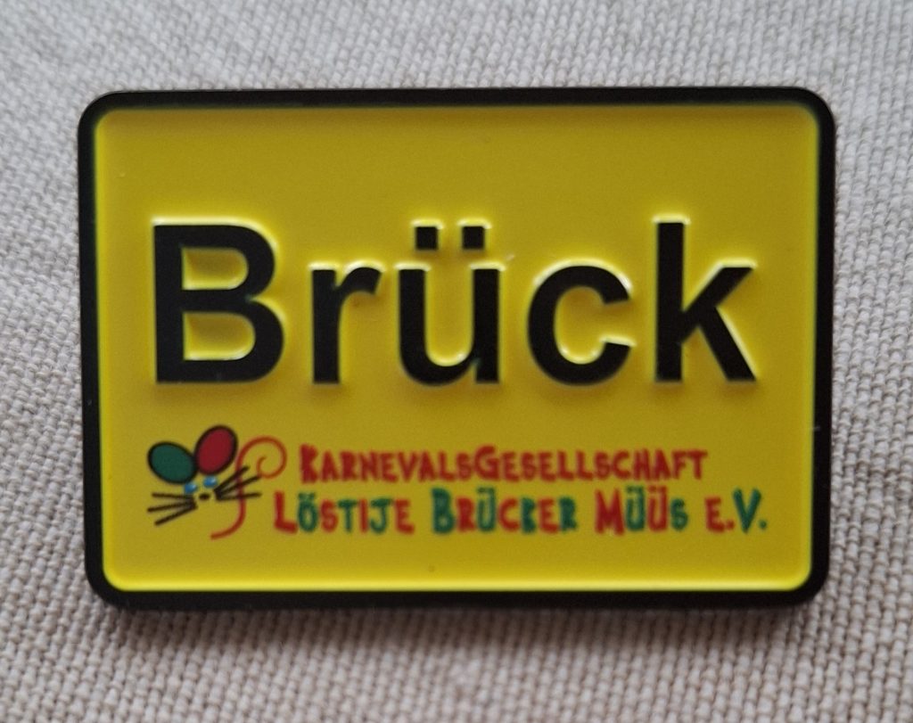 Unser Pin leuchtet wie das Ortsschild von Brück – damit jeder sofort weiß, wo Heimat und gute Laune wohnen.